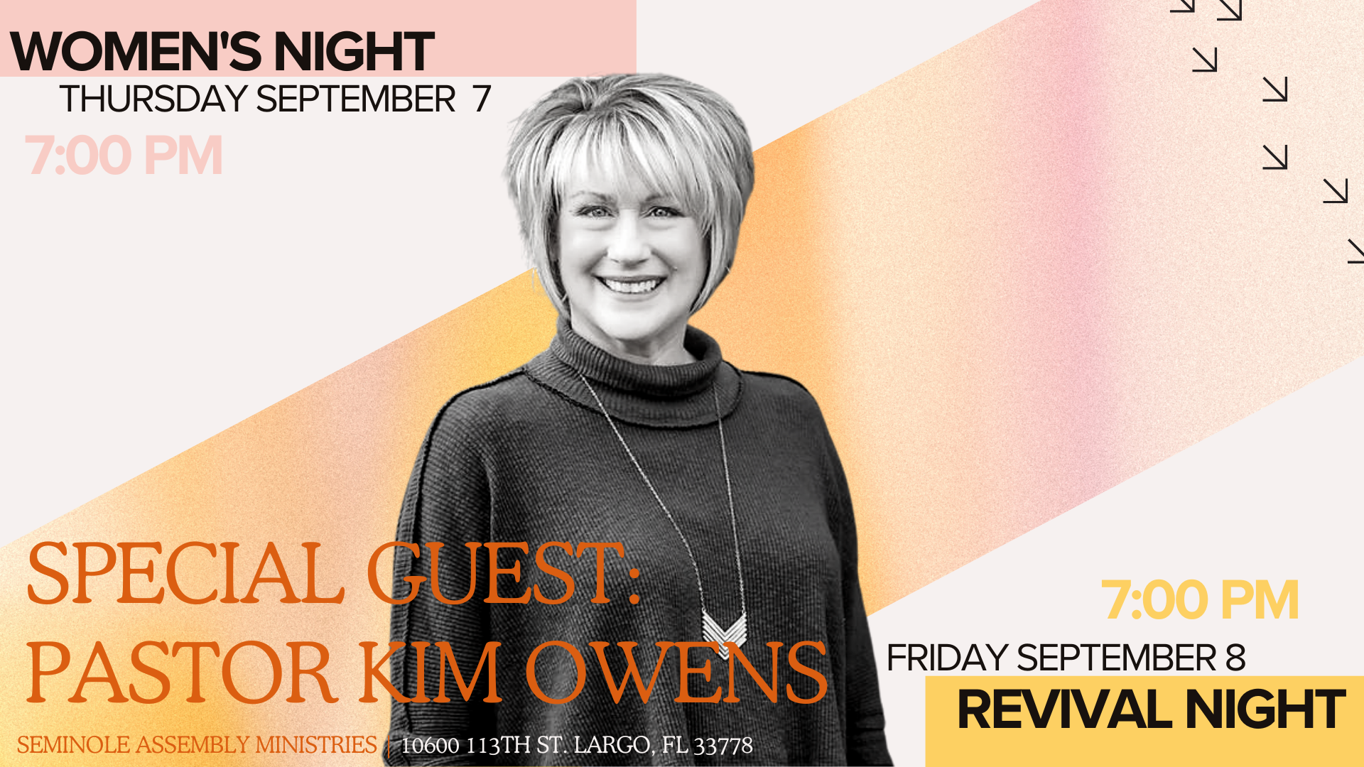 We are excited to announce special guest: Pastor Kim Owens will be with us Thursday September 7 and Friday September 8th!